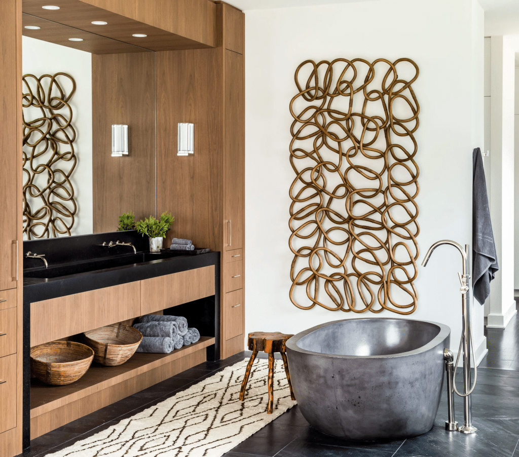 - Walnut Vanity & Black Soapstone Counter: The custom vanity features an integrated trough sink, echoing the tub’s organic materiality.