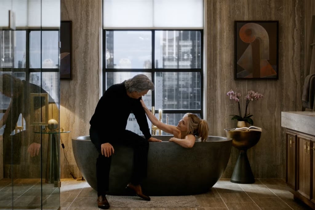 Avalon doesn’t just sit in the background. It anchors the room, shapes the mood, and, in more than a few moments, becomes part of the story itself. In fact, the tub appears three times in the trailer alone — a visual refrain that signals just how central this space is to the characters’ lives.
