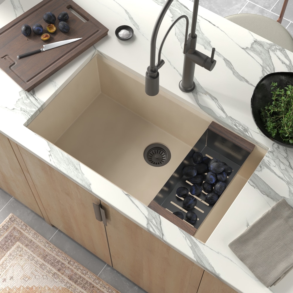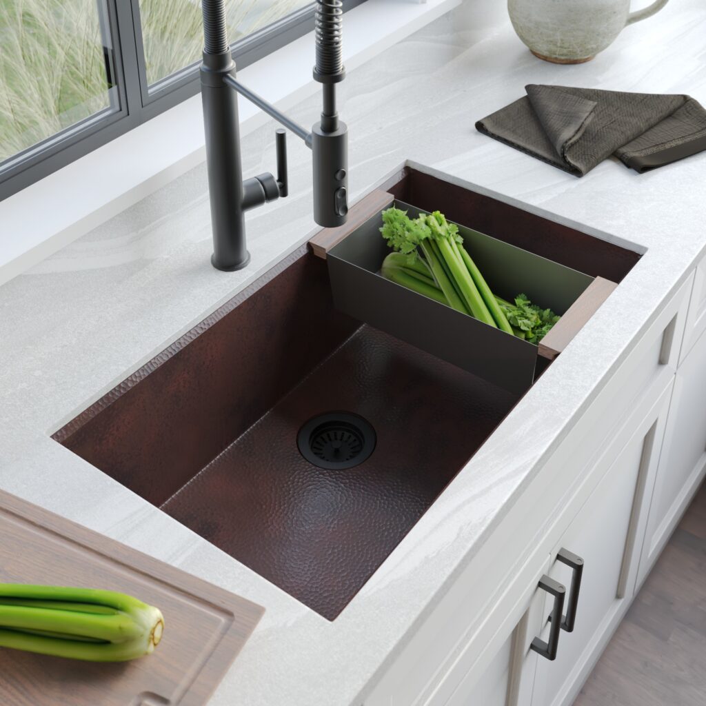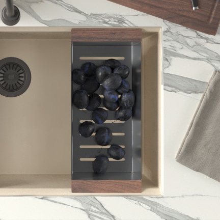 Each Concierge Collection sink features a clean, gently angled ledge to secure the included walnut cutting board and optional walnut-accented colander and drying rack – available in three luxurious finishes: Champagne Bronze, Gunmetal, and Stainless Steel.