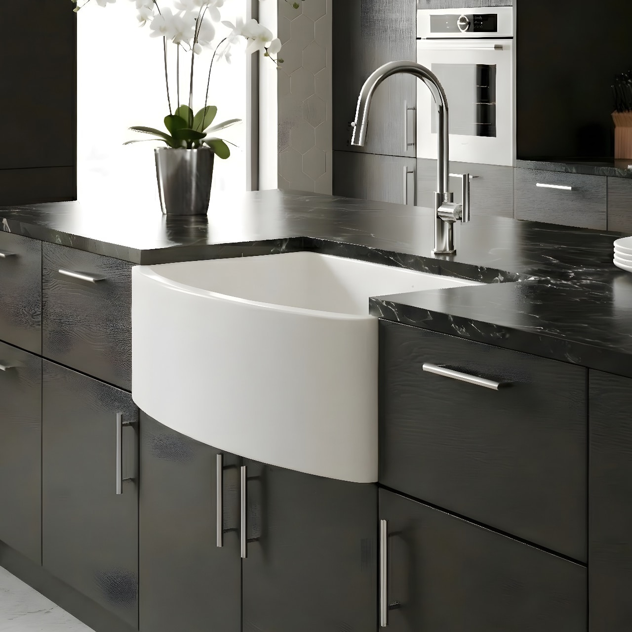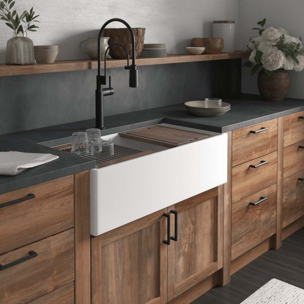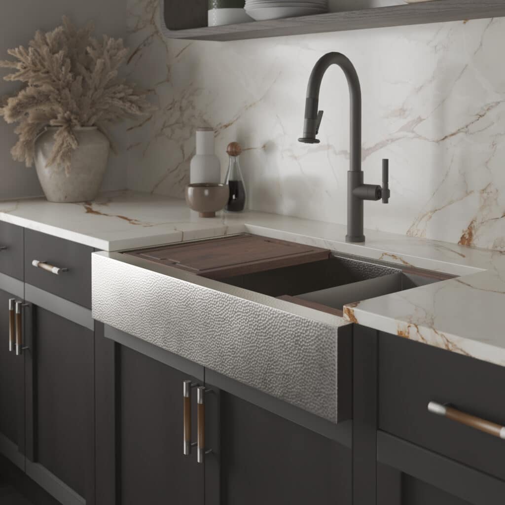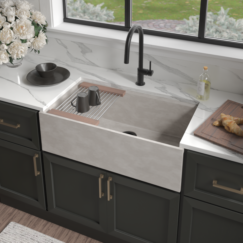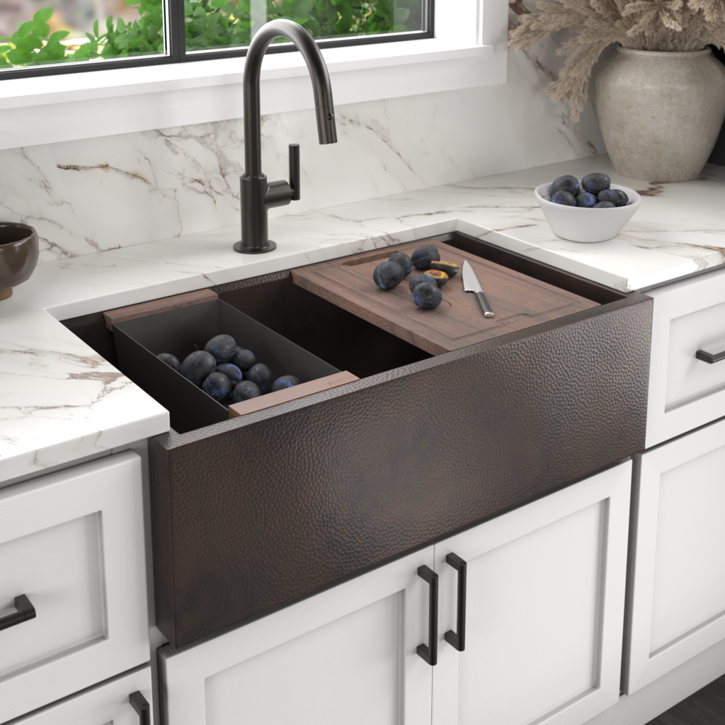 The kitchen workstation is reimagined, blending seamless function with refined, handcrafted beauty. Available in fireclay, copper, nickel & NativeStone