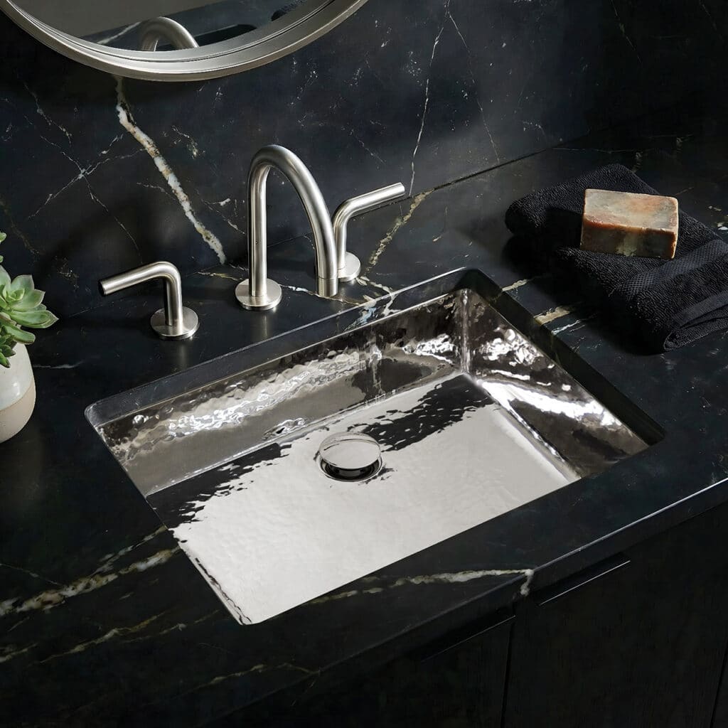 Gently hammered, beautifully luminous. A softened evolution of our traditional Heritage hammering — rooted, as ever, in character and craft. Available in Antique and Polished Nickel finishes.